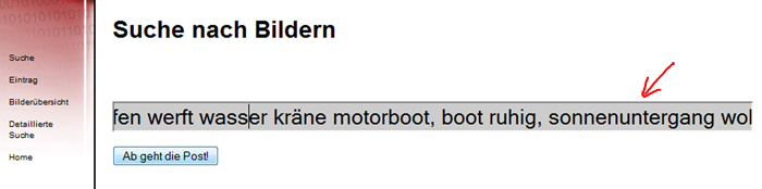 hafen werft wasser kräne motorboot, boot? ruhig, sonnenuntergang wolken!!!Nach der Auswertung wird anhand der Trefferquote deutlich, sie stark die Bilder mit den besten Ergebnissen und diejenigen mit den schlechtesten Ergebnissen auseinander liegen.   Man muss hierbei noch darauf hinweisen, dass die Suche sich nur auf die in der Datenbank bereits vorhandenen Bilder bezieht, die erstmal getaggt werden müssen. Falls Sie nach einem Bild suchen, welches noch gar nicht vorhanden ist und nur in Ihrem Kopf existiert, dann müssen Sie verwundert nicht sein, dass es nicht angezeigt wird. Falls der Suchalgorithmus nicht das gewünschte Ergebnis liefert, dann liegt es NICHT daran, dass es nicht funktionsfähig ist, sondern vielmehr liegt der Grund darin, dass entweder das Bild nicht existiert oder es noch nicht beschrieben ist. Falls Letzteres zutrifft, können Sie selbst die Schreiberling-Aufgabe übernehmen oder überlassen Sie es einem anderen! Für den Fall, dass Sie nach dem Ausprobieren und Herumspielen interessiert oder gar begeistert sind, so laden Sie doch Ihre Freunde, Verwandte und Bekannte sowie Ihren Partner zum weiteren Herumprobieren ein. Viel Spaß bei der kollektiven und sozialen Zusammenarbeit ! |